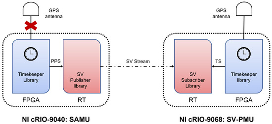 More specifically, we considered the case of synchronization failing due to disconnection of the GPS antenna from the NI-9467 board in the reference SAMU system for a few minutes. Such a communication malfunction causes the interruption of the PPS signal output from the FPGA that represents the SAMU synchronization source (see Figure 4). This leads to a value change in the SV field SmpSync, whose integer is set to 0 indicating an absence of synchronization signal. When the antenna is reconnected, the PPS signal is immediately resumed thus causing the value of the SmpSync field to change again considering the SAMU as synchronized. What it can be observed is instead an offset between the PPS and the GPS signal due to the readjustment of the NI-9467 board oscillator.