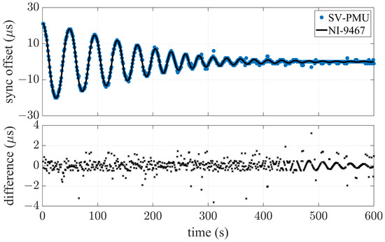 Top plot: offset from synchronization signal measured by the NI-9467 synchronization board (solid line) compared against as measured by the SV-PMU (dots) vs. time. Bottom plot: difference between measurements.