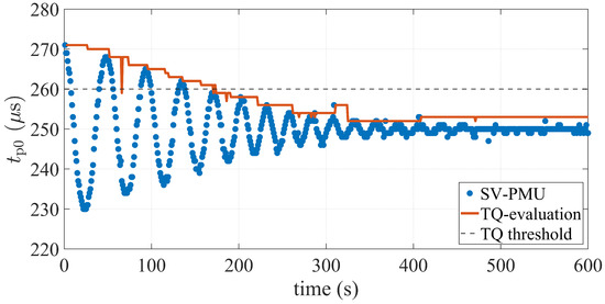 Subsequently, the value of is checked. If it is below the chosen time quality threshold TQ, the counter increases, otherwise the count is set to 0. This conservative condition implies that the value of is required to fall below the TQ threshold for a specified number of consecutive seconds before updating the status of the PMU_TQ flag. The fulfillment of this condition in this algorithm requires the counter to exceed five consecutive iterations, i.e., five seconds. This value has been chosen on the basis of empirical observations of re-synchronization curves in order to avoid the undesirable impact of certain oscillations that can be misidentified by the algorithm.