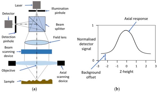 In Figure 1a, the various components of the measurement technology are shown, where the beam scanning device will raster scan a laser point over the surface to produce a confocal intensity image, which is repeated for each vertical position in the scan to produce a vertical stack of confocal images [19]. In Figure 1b, the graph shows how for each measurement point on the topography, a height point can be determined by finding the peak axial response across the vertical stack of confocal images.