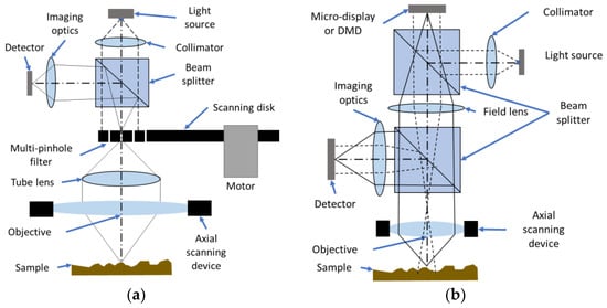 PACM, as shown in Figure 2b, uses an active micro-display to create patterns for illumination and detection [19]. In an illumination and detection mode, the operation is similar to that of DSCM, but with the disk replaced by the micro-display. Each pixel of the micro-display acts as an illumination and detection element at the same time, allowing for high-speed imaging and adjustable scanning methods (compared to a fixed physical disk), but PACM often has lower scanning speeds [19].