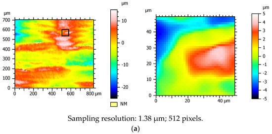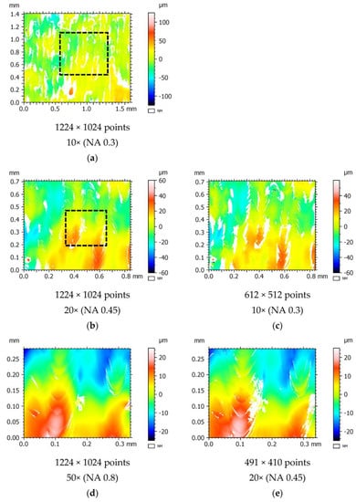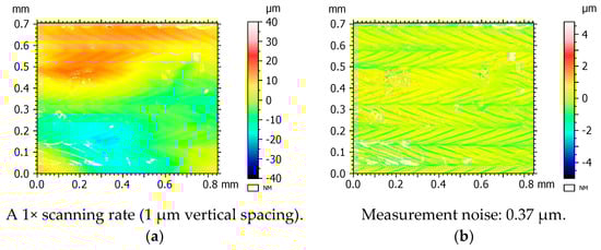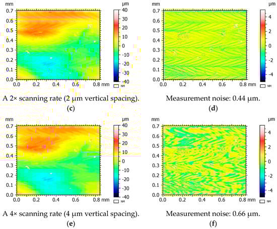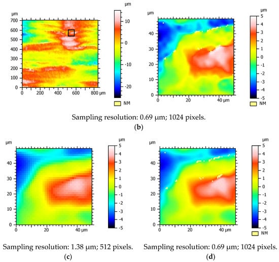 The effect of the lateral sampling resolution on measurement is visualised in Figure 6. While on the full topography there is no clear difference, there is an expected reduction in resolution between the higher and the lower resolution. This reduction in lateral sampling resolution can cause a smoothing effect to occur, as lower numbers of pixels are being used over the same measurement area. This setting might be used when considering stitching of images to measure a larger measurement area in order to reduce the file size of the measurement data, but it should be considered against whether there are small-scale features that might be filtered out by this downsampling. Moreover, the lateral resolution limitation from the objective should be considered; if this resolution is larger than the pixel size, the system/signal noise can be decreased by taking a larger sampling resolution, without affecting the topography noise. The same can be achieved by applying an S-filter [31]—an effect that can be seen in Figure 6c,d.