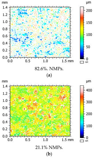 - Non-measured points (NMPs) were calculated as a percentage of the sum of NMPs over the total measured points of the surface topography within each height map. These are points for which the instrument does not acquire enough information, flagged by the instrument itself as non-measured. The lower this value, the better, provided no spikes appear and/or the noise is increased.