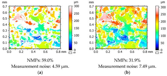 Height map visualisation of a PBF-LB Ti-6Al-4V side surface measured at 10× objective magnification, using identical settings apart from the scanning strategy: (a) CSSS mode; (b) CSDS mode. White regions in the height map represent NMPs.