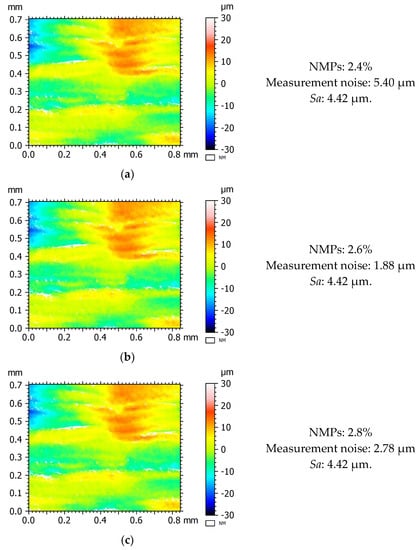 In summary, the conclusions of this work should be explained within the context that the metrics used in the analysis come from the measured data acquired using the confocal instrument. While Sa does not appear to drastically vary between setup configurations, it is much harder to say whether the metrological quality of the topographies is better or worse in certain setups—especially in terms of accuracy. The number of NMPs is a parameter that comes directly from the instrument, and the measurement noise by subtraction ought to be compared with a reference of higher accuracy and, perhaps, known uncertainties with statistical models.