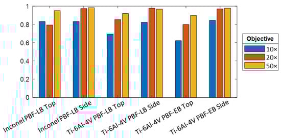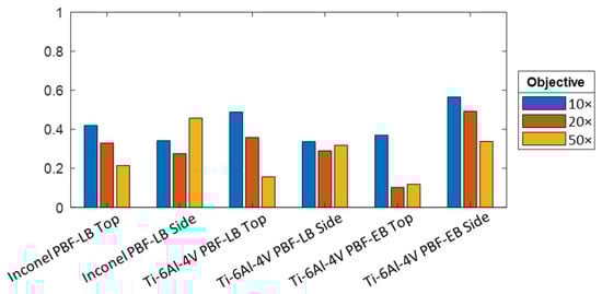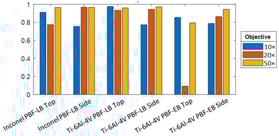 In Figure 10, Figure 11 and Figure 12, the coefficient of determination for the linear models is plotted for all metrics, surface types, and objective magnifications. This coefficient will only represent the fitting between the statistical model, its predicted results, and the experimental results; it is this model that was later used to determine the significance of factors (i.e., measurement process parameters) through ANOVA [33]. Figure 10 shows the R2 for models for the number of NMPs, with most of the results for higher objective magnifications showing a good fit with the model (i.e., R2 close to or greater than 0.8). The 10× objective shows weaker fits for all models, with the weakest fits found for the PBF-LB top surfaces. All models show weaker relative fits to the model for top surfaces than for side surfaces.