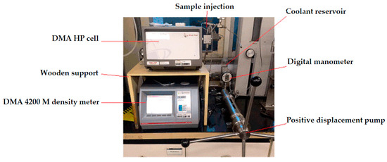 In recent years, including in the oil and gas industry, interest in studies of measurements of density at elevated temperatures and pressures has increased in the various production chains related to fluids [9,10,11,12,13,14]. More specifically to Anton Paar densimeters, a DMA60/DMA602 density meter system has been used to measure the density of sulfolane in binary mixtures with six aromatic hydrocarbons at 298.15 K [15]; a DMA 4200 M densimeter was calibrated with water and toluene as standard liquids at pressures from 0.1 to 50 MPa and temperatures from 293.15 to 453.15 K [16]; and a DMA 512 density meter has been used to measure the density of dimethyl ether (RE170) at high pressure [17].