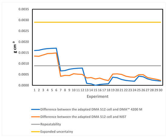 As expected, the density results at the same temperature increased with increasing pressure, as far as the volume decreases. For temperatures of 5 °C and 20 °C, the densities calculated by the adapted DMA 512 cell are slightly higher than DMA™ 4200 M and NIST. For the temperature of 37.8 °C, the density values calculated by the proposed methodology are practically identical to those of the DMA™ 4200 M or are between the values of the DMA™ 4200 M and those tabulated by NIST. For temperatures of 50 °C and 70 °C, the densities calculated by the adapted DMA 512 cell are slightly lower than DMA™ 4200 M and NIST. For the lowest temperature, i.e., 5 °C, the maximum absolute differences between the proposed approach and both the DMA™ 4200 M and NIST approaches did not exceed the measurement uncertainty until experiment six. However, for all other temperature ranges, these differences were much smaller, being within the repeatability of the test method (Figure 2).