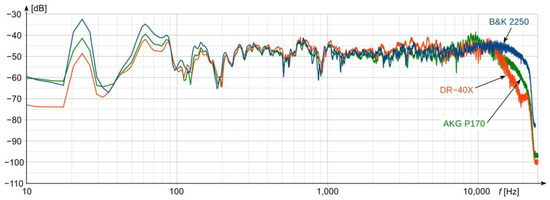 The comparison of results presented in Figure 2 shows that, in the frequency range from 100 Hz to 10 kHz, the spectrum for all three devices is very similar. Small differences in the level do not exceed several dB. A slightly lower compliance in the range from 3 to 10 kHz results from the presence of standing waves in the chamber which, in combination with small differences in individual microphone transducer positions in space, gave the effect of some differences in the spectrum shape. Greater deviations between the reference and other devices are present in the areas of very low and very high frequency. They are caused by less linear frequency responses of microphones embedded in the TASCAM recorder and AKG microphone in comparison with the reference instrument—with 2250L Bruel & Kjaer meter. However, the AKG microphone clearly has better frequency parameters compared to the built-in TASCAM microphone, which would contradict the parameters of both devices provided by their manufacturers.