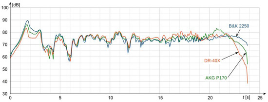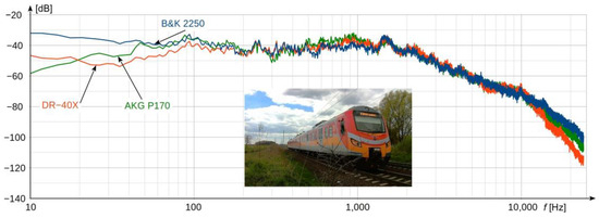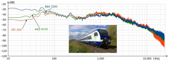 In order to confirm the laboratory research results, all the three analyzed devices were compared in field conditions. For this purpose, environmental noise generated by a passing train was measured. All the recording devices were located in accordance with requirements of the ISO 3095 standard [50]. Measurements were performed in a flat-terrain area. During the measurement, the air temperature oscillated around 12 °C, with a relative humidity of 45%. The comparison of the results obtained for two selected electrical multiple units (EMUs) are shown in Figure 4 and Figure 5. Registrations were made during a single passage of each train. The speed of both EMU’s was approximately 110 km/h.