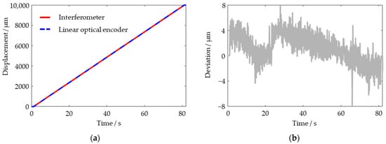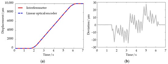 The experiment results (after linear error compensation) are shown in Figure 3, Figure 4 and Figure 5. Firstly, the platform moved 10 mm at a maximum speed of 2.5 mm/s. The sample rates of both the interferometer and the linear optical encoder are 10 Hz. As Figure 3a shows, the curves fit well with each other, even in the acceleration and deceleration periods. Data at the endpoints are 9983.10 μm (optical encoder) and 9983.0674 μm (interferometer), respectively. Since the sample time of the optical encoder and the interferometer are unsynchronized, the derivation data shown in Figure 3b are linearly interpolated. Deviation of the 10 mm motion is within ±30 μm, which is mainly contributed by the straightness and the interpolation process. A perturbation with a period of 4 mm can be observed from the deviation data, which is consistent with the thread guidance of the motor stage.