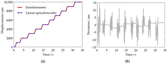 Further, the platform was driven in continuous 1 mm steps. As Figure 4 shows, the 1 mm steps are too short to fully accelerate, so the maximum velocity is about 1.4 mm/s. As a result, the perturbations during the motion of the motor stage are significantly reduced. Figure 4b shows that the deviations during the moving period are within ±15 μm, while the deviations during the stable period are within ±2.2 μm.