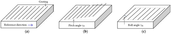 Further, the position of the grating is additionally taken into consideration. In an ideal calibration, the direction of grating pitches should be in parallel with the laser wavelength (no matter if they are in parallel with the movable platform). But in an actual system, only the projection of grating pitches is taken into account. As Figure 8 shows, if the pitch and roll angles of the grating are not zero, the projection of grating pitches in the wavelength direction will change. The changes lead to cosine errors, as shown below.