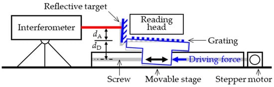 The most critical principle in designing the calibration system is the Abbe principle [20]—namely, the measurement arm of the interferometer should be in line with the pitches of the encoder (see Figure 1). More strictly, the driving direction and measuring axes should also be co-linear. Since most of the commercial motor stages could not meet this requirement, as a result, the influence of tilts on the measurement will be amplified. Further discussion is in Section 3.