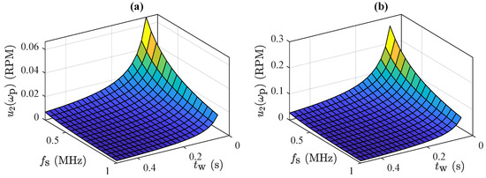 Resolution for the period measurement method considering the mean period among all pulses in a time window, as stated in (16), for two scenarios: (a) angular speed of 1000 (104.72 rad s−1) and (b) angular speed of 4000 (418.88 rad s−1).