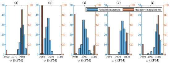 In Figure 6a, at around 1000 (104.72 rad s−1), despite the operating condition being an integer and multiple of the resolution provided by (5), the frequency method pointed to occurrences at 980 (102.62 rad s−1), resulting in a bias towards lower angular speeds. In Figure 6b, with the motor operating at 1005 (105.24 rad s−1), the frequency method shows only the occurrence of 1000 (104.72 rad s−1). In Figure 6c, with an operating angular speed of 1010 (105.76 rad s−1), which is in the middle point of two multiples of the resolution for this configuration (1000 (104.72 rad s−1) and 1020 (106.81 rad s−1)), the occurrences were not balanced, shifting towards a lower angular speed calculation. In Figure 6d,e this bias towards a lower angular speed calculation continues. The results in Figure 7 present similar results to those in Figure 6.