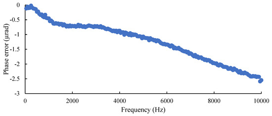 The phase error for frequencies from 50 Hz to 10 kHz was well below ±3 µrad. The phase error measurement results shown in Figure 3 demonstrate a continuous and linear increase in magnitude as the test signal frequency increases. Such linear dependence of digitizer phase error can be attributed to a constant time delay between the measurement channels, which would appear as a continuously increasing phase angle with the increase of frequency in frequency domain measurements.