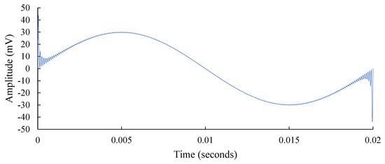In the case of evaluating the accuracy of the PXI-5922 digitizer complex voltage ratio and phase difference measurement under composite waveforms, a worst-case signal consisting of multiple harmonic components was selected. This signal consisted of a 30 mV fundamental frequency component at 50 Hz and all the harmonic components from 100 Hz to 10 kHz, with each having an amplitude of 1% of the fundamental component. Figure 4 shows the time domain waveform of the test signal.