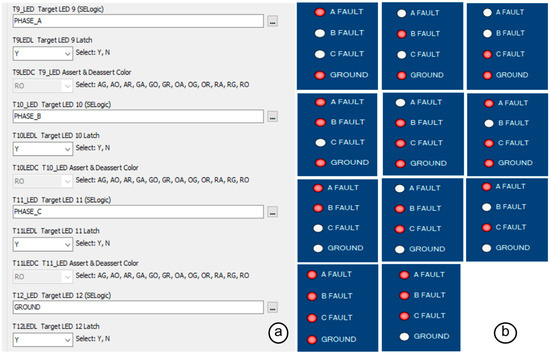 A misoperation analysis of the set-default relay method and the boundary admittance method for the detection of electrical fault types in relays was performed with two identical SEL 451 relays [18]. While the set-default relay method was based on an internal algorithm applied to the protection device by itself, the boundary admittance method was implemented using an external algorithm applied in an RTS. The set-default relay method uses A, B, and C phases and ground targets that are based on illuminating the relay targets. This method defines which phases and/or grounds are involved in an electrical fault. The relay logic target words for the phases (A, B, and C) and ground (GND) status are included in the default relay settings for the T9_LED to T12_LED settings, as shown in Figure 1a. The fault types were defined as line-to-ground (LG), line-to-line (LL), three-line (3L), line-to-line ground (LLG), and three-line-to-ground (3LG) electrical faults and were detected based on the electrical fault target lighting in Figure 1b. The acSELerator QuickSet SEL-5030 software (version 7.2.2.4) was used to set the SEL 451 relays and collect the plots in Figure 1.