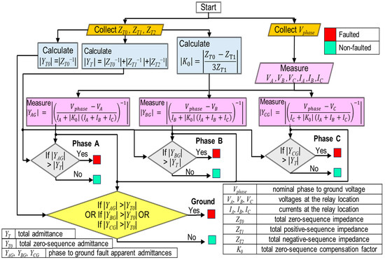 The boundary admittance method was based on implementing an external logic circuit using the algorithm in Figure 2, based on a previous algorithm presented by Dr. Piesciorovsky [28]; it was validated with a software simulation without relays in the loop. It needs to calculate the total admittance (YT), the total zero sequence admittance (YT0), and the zero sequence compensation factor (K0) for the electrical grid circuit. The phase currents and voltages are measured at the relay location to calculate the PGFA admittance for phases A, B, and C. The phase and ground boundaries define the phase and ground faults based on identifying the desired conditions of the phases (A, B, C) and ground light indicators (Figure 2) for faulted and non-faulted states.