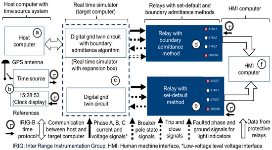 Digital twins have received significant attention in various industry domains, replicating physical systems of the real world as digital systems in the digital world [29]. In power system applications, digital twins have been used to monitor power system operations. In robot applications, digital twins have provided the framework for establishing interfaces for various manipulator systems [30]. In metrology applications, digital twins have been used to investigate the impact of misalignment on individual optical elements [31], with the development of digital twins for optical measurement systems, creating an algorithm for a laser line scanner [32]. Another digital twin system has been used for meteorological applications, considering the essential requirements of simulating meteorological uncertainties [33]. Digital twins are created through simulations and off-line programs [34]; then, digital twin prototypes can be used for monitoring and testing applications to allow the verification of a process [35]. In this study, an Advanced Synchronized Time Digital Grid Twin (ASTDGT) testbed with paired relays is presented to assess the detection of different electrical fault types in a power grid, comparing the boundary admittance (external algorithm) method with a set-default (internal algorithm) relay method.