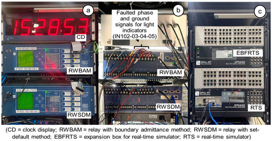 Inside the RTS (target computer), the digital grid twin circuits were set with the boundary admittance algorithm (Figure 3c). One digital grid twin circuit with the boundary admittance algorithm (Figure 3c) was connected to a relay (Figure 3d), and another identical relay with the set-default algorithm (Figure 3e) was connected to the second digital grid twin circuit (Figure 3c). The HMI computer (Figure 3f) collected the data from the relays. The host computer (Figure 3a) downloaded and ran the RT-LAB project to execute and supervise the tests. The RTS (Figure 3c) generated the phase current and voltage signals (solid arrows), which were injected into the relays and generated the breaker pole state signals (square arrows) that were collected from the relays. The relays generated the trip/close signals (dotted arrows) that controlled the breakers inside of the digital grid twin circuits. The phases (A, B, C) and ground light indicator signals (double-dashed arrows) were generated from the boundary admittance algorithm in the RTS and collected by the relay (Figure 3d). The time source (Figure 3b) could be synchronized using a GPS antenna (or an internal clock of the time source), which set the same time stamp for all relays with the Inter Range Instrumentation Group-B protocol. This protocol is an important tool for assessing the time stamps from the recorded events for both relays by observing whether a delay time is present in the implemented boundary admittance method. Figure 4a shows the relay front side with the clock display (CD) and the relays. Figure 4b shows the relay rear side with the faulted phase and ground signals for the light indicators connected to the control input IN202-03-04-05 of the relay with the boundary admittance method (RWBAM). Figure 4c shows the RTS with an expansion box that simulates the digital grid twin circuits for the relays and the boundary admittance algorithm.