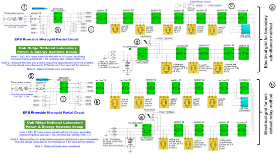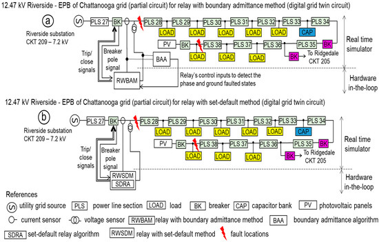 In this experimental model, the digital grid twin was created in an RT-LAB project using part of the Electric Power Board (EPB) Riverside substation [22]. Single-line diagrams of the electrical grid for the digital grid twin are shown in Figure 5. This electrical configuration was a radial system with a 7.2 kV phase-to-ground voltage. The digital grid twin grid circuits were set into the RTS (Figure 5a,b), and the relays were the hardware-in-the-loop. In Figure 5a, the boundary admittance algorithm was run inside the RTS, and the outputs of the algorithm were wired to the relay’s control inputs. However, the set-default relay algorithm was run inside the relay (Figure 5b). The boundary admittance algorithm (Figure 5a) and the set-default relay (Figure 5b) algorithm were applied between power line sections 27 and 38. The purpose was to assess both algorithms for different electrical faults near the relay’s breaker and at the end of power line section 38.