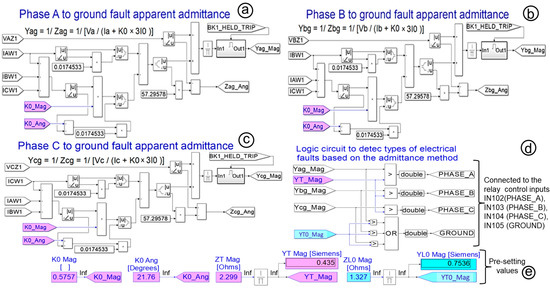 Phase-to-ground fault apparent admittance algorithm for phases A (a), B (b), and C (c) with the logic circuit (d) and pre-setting values (e) to find out the electrical fault types.