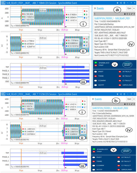 Phase currents (i), phase-to-neutral voltages (ii), digital signals (iii), event data (iv), and phase/ground LED (v) results from the relays with the boundary admittance (a) and set-default (b) relay methods.