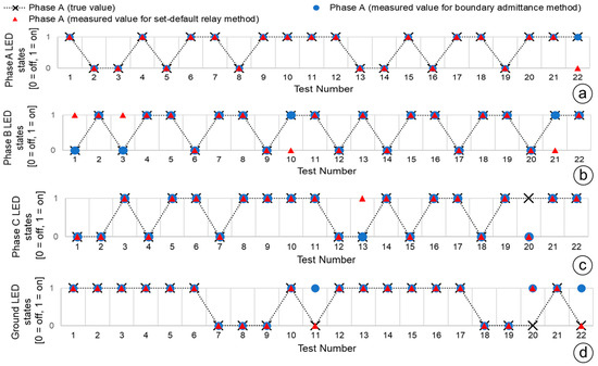 The results for the phase (A, B, C) and ground LEDs from Table 3 are plotted in Figure 9. The true and measured values for the phase and ground LEDs were compared to see how they matched for both the set-default relay method and boundary admittance method. Black cross dots represent the true values, and blue and red dots represent the measured values for the boundary admittance and set-default relay methods, respectively. The phase (A, B, C) and ground true values versus the measured values are shown in Figure 9a, Figure 9b, Figure 9c, and Figure 9d, respectively.