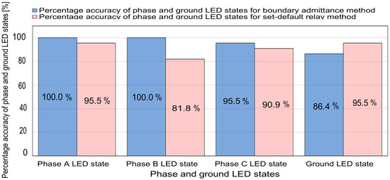 Based on Figure 9a,d, the number of measured values matching the true values for the boundary admittance method and the set-default relay method in the phase (A, B, C) and ground states are shown in Table 4. The percentage accuracy of the boundary admittance method and the set-default relay method for the phase and ground LEDs states was calculated with Equations (10) and (11), respectively, using the results from Table 4. Figure 10 shows the percentage accuracy of the phase (A, B, C) and ground states for the boundary admittance method and the set-default relay method.