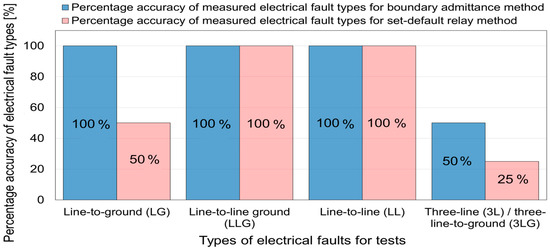 Figure 11 shows the percentage accuracy of the types of electrical faults using the boundary admittance method and the set-default relay method, which was calculated using Table 5 and Equations (12) and (13).