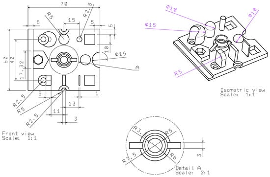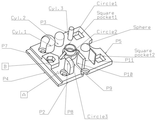 The chosen part’s design is represented in Figure 1 and incorporates elements specifically intended to measure different geometrical deviations, including the following: