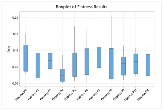 Before analyzing the results, the integrity of the data was ensured by checking for outliers using boxplots for each measurement. Figure 3 shows an example of a boxplot of flatness for datum plane A and other measured planes. This preliminary step confirmed that the data were clean and reliable for further statistical analysis.