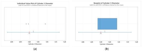 Individual value plot of cylinder 3 diameter measurements in [mm] (a); boxplot of cylinder 3 diameter measurements in [mm] (b).