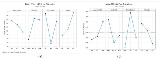 Taguchi analysis graphs: main effect plot for the means (a) signal-to-noise ratio (b) for flatness of datum plane [A] versus layer height; material; print speed; nozzle.