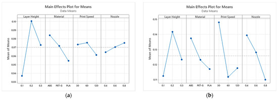 Next, a Taguchi analysis was performed to examine the perpendicularity deviations of the planes P2-A, P3-A, P4-A, P, P5-A, and A-B versus layer height, material, print speed, and nozzle size (detailed in Table 6 and Figure 6a). Additionally, the parallelism deviations of planes P4-B, P5-B, P8-B, P9-B, P10-B, and P11-B were analyzed against the same factors (detailed in Table 7 and Figure 6b).