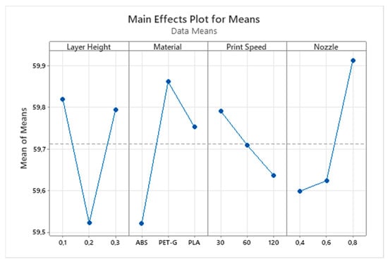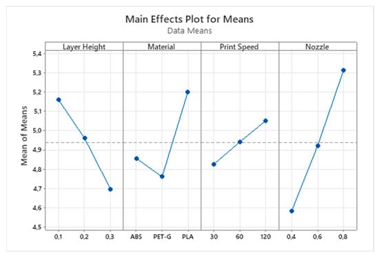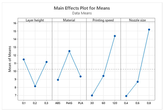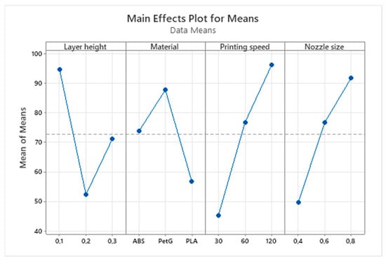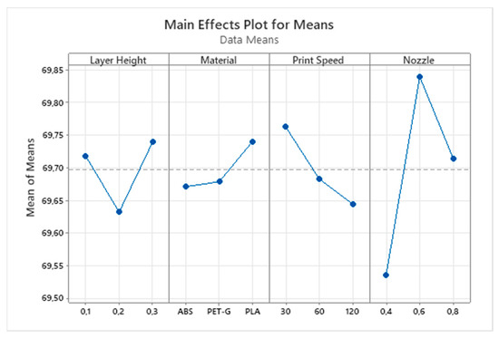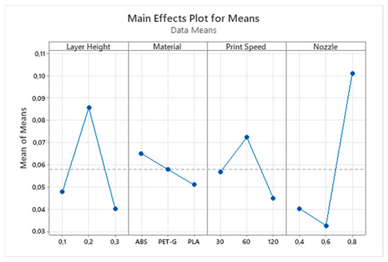 Because datum plane A has the largest surface and serves as a critical reference for other measurements, we chose to first analyze the influence of the fabrication parameters on this plane. The Taguchi analysis for flatness on datum plane A involved evaluating the signal-to-noise ratios and means for layer height, material, print speed, and nozzle size.