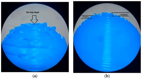 After a visual inspection using a stereo microscope, it was validated that the nozzle size and layer height significantly influences spherical shape accuracy in 3D printing. Microscope images allowed for a more detailed inspection on the layers that build the spherical shape, revealing that the last layer (top layer) contributes notably to the spherical shape’s deviation. For example, a 0.3 mm layer height and a sphere diameter of 10 mm result in approximately 33 layers, requiring an extra 0.1 mm layer to achieve the finished height. If the layer slicing division is not a whole number, the slicing software may either omit the excess, resulting in a slightly shorter sphere (approximately 9.9 mm), or not fully compress the final layer, leading to an increased final layer height (0.33 mm in our case), as seen in Figure 8b. Conversely, using a 0.2 mm layer height for the same sphere requires 50 layers, a whole number, which can affect the top spherical shape due to the larger diameter of the final layer compared to the 0.33 mm last layer (Figure 8a).