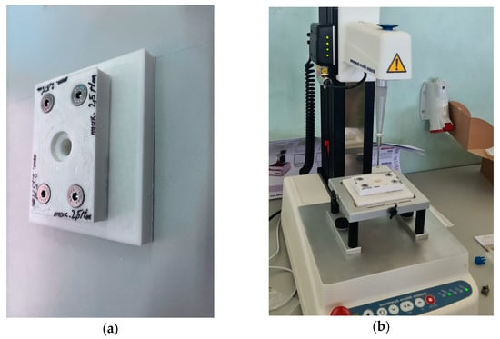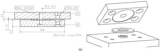 To validate the practical application of the research findings, a fixture device for a texture analyser was fabricated using FDM technology. The design of this fixture required the upper plate to be installed in two different positions (Figure 15a,b), with or without a retaining ring. This made the concentricity and cylindricity of the central hole from the three different components into a critical tolerance, along with the flatness deviation required to precisely orient the device on the texture analyser (Figure 15c).