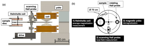 Setup of the developed test rig. (a) Overall design of the test rig with the magnetic field stage, including a magnetic yoke and coils. The measurement system consists of a Helmholtz coil for integral measurements and a scanning Hall probe for local measurements of the temperature-controlled sample on the sample disc. (b) Schematic overview of the rotating sample disc, highlighting static components in black and rotating objects in white. During one rotation, the sample is measured for average magnetization by the Helmholtz coil (1), scanned by the Hall probe (2), and demagnetized by the magnetic yoke (3).