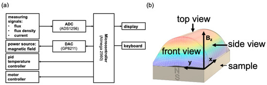 The analog measurement signals of the fluxmeter and Hall probe are converted by a 24-bit analog–digital-converter (Texas Instruments ADS1256) and transferred to an Arduino microcontroller [22,23], which also controls the fluxmeter, field source and sample disc rotation (Figure 2a).