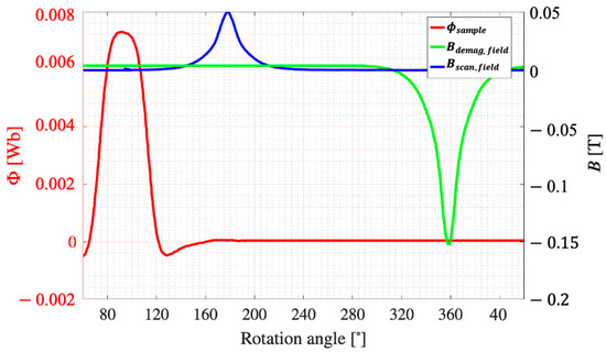 Figure 3. Measuring signals during one full sample rotation (0°–360°). Helmholtz coil flux (magnetic flux (red), position: 90°); scanning Hall probe (Bscan field (blue), position: 180°); demagnetization field (Bdemagnetizing field (green), position: 270°). - Field scanning at about 180° (Figure 3, blue): mapping of the magnetic field over the sample surface.
