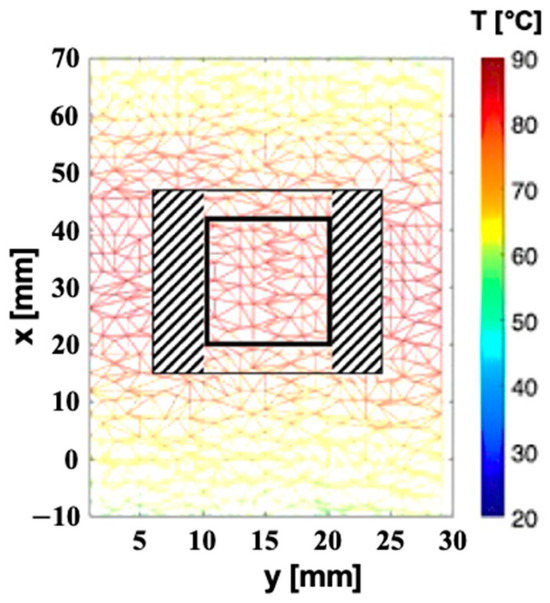 The sample temperature is controlled and measured by thermocouples on both sides of the heating unit. Initial tests with several thermocouples attached to a sample body showed a uniform temperature over the sample volume. An infrared (IR) sensor (GY-904) mounted next to the Hall probe of the scanner allows us to further measure the IR emission from the sample surface, resulting in thermal maps of the temperature distribution [10]. The IR temperature measurement accuracy is ensured by applying Kapton tape with an emissivity of 0.95 to the sample surface according to [10]. The thermal map in Figure 4 shows a uniform temperature of approximately 80 °C in the central sample area (black box). The position of the heating unit is also shown (shaded areas).