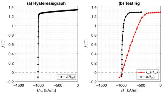 Figure 6 shows the demagnetization curve of an N52-SH sample at 80 °C measured with the magnetically closed circuit hysteresisgraph (Permagraph, Magnet-Physik GmbH, Figure 6a) and open-circuit test rig (Figure 6b, red). It can be seen that the test rig shows reasonable polarization levels (of 1.28 T (test rig) to of 1.32 T (hysteresisgraph)) and good agreement in the intrinsic coercive field, where is close to zero ( of −1002 kA/m (test rig) to of −1011 kA/m (hysteresisgraph)). The curves in Figure 6 are different due to the different measurement methods, where the closed-circuit hysteresisgraph measures , while the open-circuit test rig measures the recoil polarization in the absence of the demagnetizing field. A rough determination of intrinsic material properties is possible by adjusting the curve (Figure 6b, red) to (Figure 6b, black) using an average demagnetization factor (N = 0.49) [24] for H and an estimated recoil permeability ( = 0.03) for J. However, the primary goal of this setup is to show inhomogeneities rather than a precise reproduction of the demagnetization curves.
