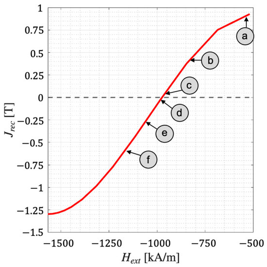 Demagnetization curve () of the N52-SH sample at 80 °C with marked magnetization states for corresponding field plots in Figure 9. The following demagnetizing field strengths labelled [kA/m] are used: (a) −520, (b) −810, (c) −930, (d) −980, (e) −1050; (f) −1190.