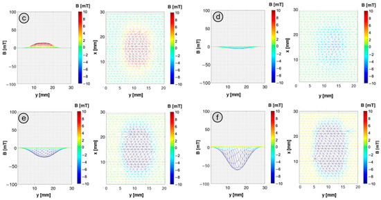 (a–f) Series of field visualizations corresponding to the magnetization states in Figure 9 for the non-segmented sample N52-SH at 80 °C. (Left) side view (); (right) top view (. The following demagnetizing field strengths labelled [kA/m] are used: (a) −520, (b) −810, (c) −930, (d) −980, (e) −1050; (f) −1190.
