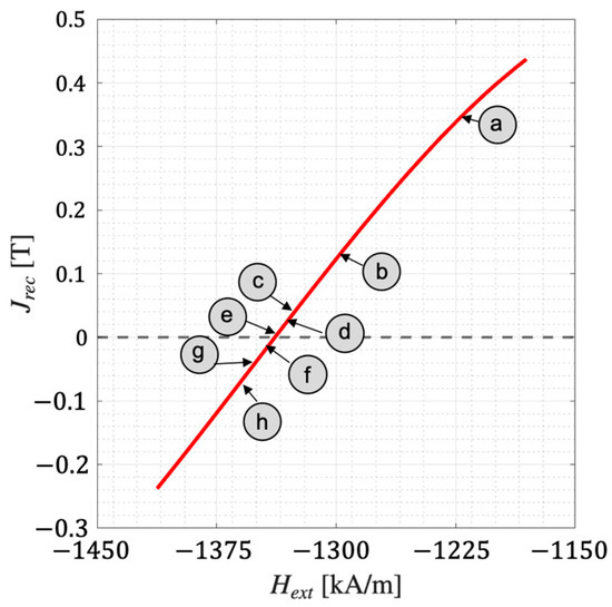Demagnetization curve () of the N52-UH sample at 80 °C with magnetization states (marked) for corresponding field plots in Figure 12. The following demagnetizing field strengths labelled [kA/m] are used: (a) −1225, (b) −1300, (c) −1320, (d) −1324, (e) −1330, (f) −1335, (g) −1340; (h) −1350.