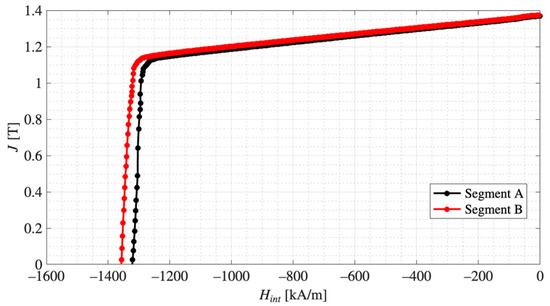 The non-uniform demagnetization behavior observed in the segmented sample near the coercive field suggests different coercive fields in the two segments as a possible reason. This variation in coercivity could be either due to temperature gradients in the sample or due to differences in the magnetic properties of the two segments. However, the measurements of the temperature distribution, as explained in Section II, C, did not support the first explanation. In order to identify differences in the material properties between the two segments, the segments were separated at their bond line after applying a temperature of approximately 400 °C. The magnetic properties of the two segments were then measured individually in the hysteresisgraph. Figure 12 shows that segment A has a measured coercivity of −1321 kA/m, while segment B has a coercivity of −1357 kA/m. The observed variation of around 30 kA/m (2.5% of coercive field strength) is in line with measurements from 10 other samples of the same quality, which also demonstrate variances within the range of 30 to 70 kA/m. Variations of this magnitude are not uncommon, as evidenced by manufacturer data sheets [25,26]. These data sheets typically provide a minimum value for the intrinsic coercive field strength, rather than specifying narrow limits, in contrast to other parameters. These measurements demonstrate that the equipment is capable of detecting local differences in coercivity using the in situ scanning Hall probe of the test rig and the entire demagnetization setup.