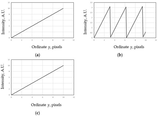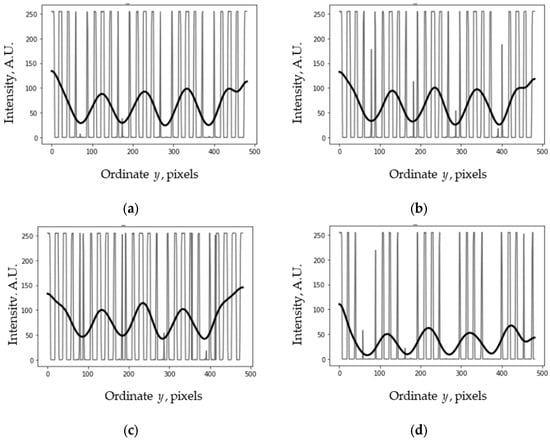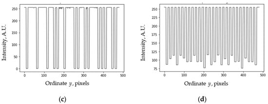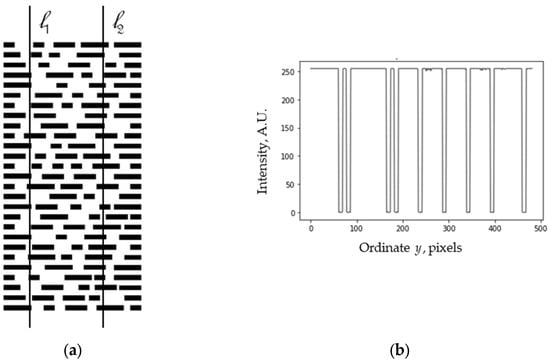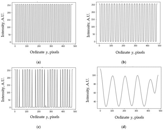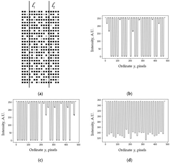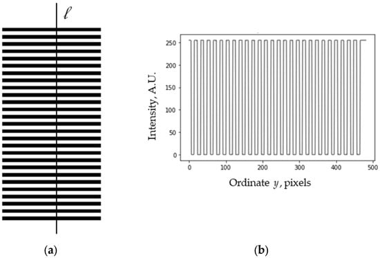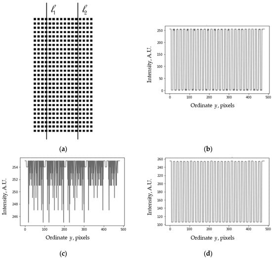 Previously [], we considered grids with a rectangular profile consisting of solid straight lines, shown in Figure 12a. The grid’s intensity profile, i.e., its cross section along a line (l) perpendicular to the grid lines (in this example, vertical), is shown in Figure 12b (the intensity was measured in 8-bit units from 0 to 255). The profile is the same for all the parallel vertical lines within the grid.